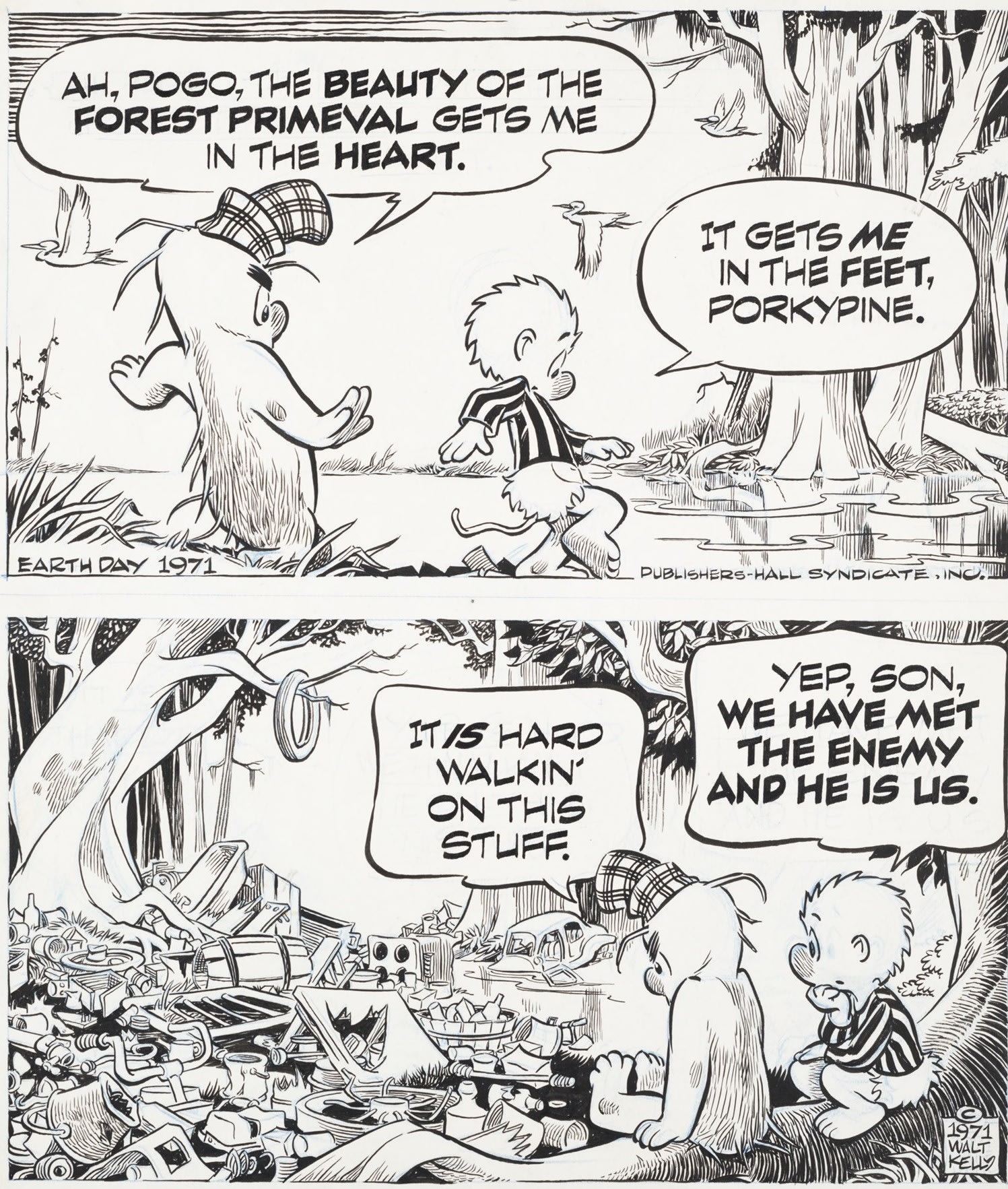 The quip first appeared in a poster Kelly designed to help promote environmental awareness and publicize the first annual observance of Earth Day, held on April 22, 1970. Kelly used the line again in the Pogo strip published on the second Earth Day in 1971.