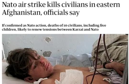It’s not that atrocities committed by Western troops were not reported on in mainstream news outlets. They were, and are, albeit in rapid-fire fashion, almost subliminally appearing and disappearing, laden with euphemisms like “precision strikes” or “Islamic extremist terrorists hiding among civilians.” While Taliban fighters are at the same time Islamic extremists and Afghan resistance fighters against an invading force, the latter is brushed over –lest they garner any kind of sympathy.
