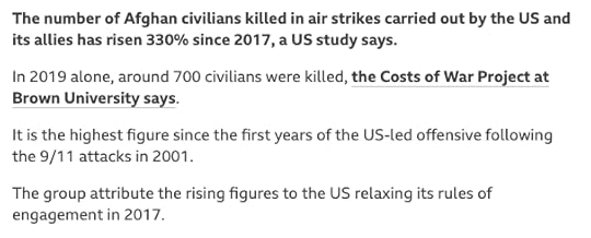 According to a Brown University study, over the past 20 years, 241.000 Afghans were killed, including 71.000 civilians. That’s 10 civilians per day, every day, for 20 years. News agency AP counted 47.245 civilians (the most conservative estimation I could find). Theconversation.com says: “…at least 100.000 Afghan civilians killed or injured in the conflict between the U.S.-led coalition and Afghans resisting its occupation of their country. This number should be considered an undercount, as many Afghan casualties were buried quickly following Islamic customs, and records were not kept.”