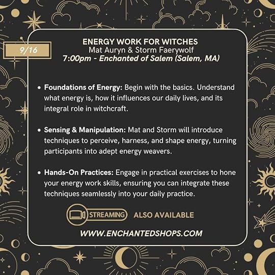 We look forward to seeing everyone and presenting our classes at  TempleFest this year!Sadly, registration for that multi-day event is closed. BUT Mat and I are offering some classes in the Salem, MA, area the week prior, including a FREE book signing/meet & greet. Follow the links below for more info or to reserve your spot!——🦉 Energy Work for Witches
