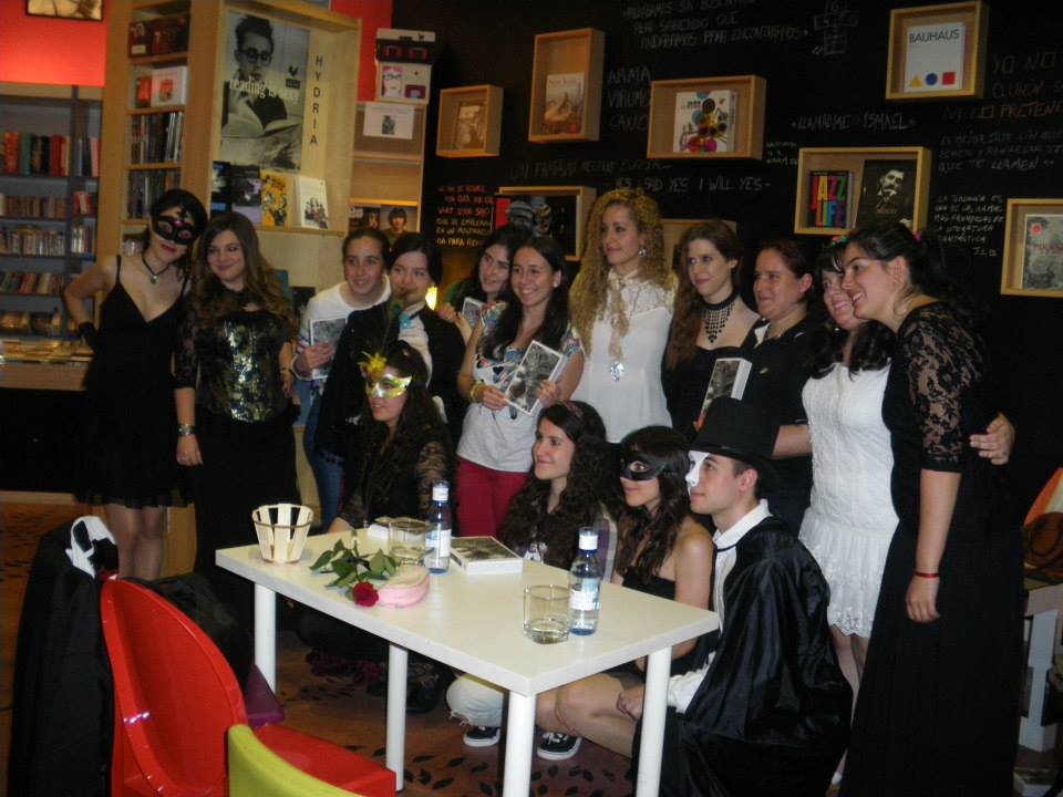 Y en tercer lugar, también quería contaros que durante estos meses he participado en unos cuantos eventos como un encuentro con los chicos del club de lectura Contenedor de Océanos de la Fundación Germán Sánchez Ruipérez, una lectura en el Como lo Oyes de la Facultad de Traducción y Documentación de la Universidad de Salamanca, una presentación de Las eternas en la Asociación Tierno Galván de Santa Marta de Tormes, una mesa redonda en plena Plaza Mayor de Salamanca con motivo de la Feria del Libro en la que debatimos sobre el futuro de la publicación en papel y la publicación digital... ¡y también me he estrenado como presentadora! El jueves de la semana pasada la escritora Sandra Andrés vino a hablarnos de su maravillosa novela Ex Libris en la Librería Hydria, y Eva Rubio de Juvenil Romántica y yo misma ejercimos como presentadoras. Fue un evento de lo más emocionante; para hacer algo acorde con la temática de la novela decidimos vestirnos con ropa decimonónica y nos pusimos máscaras mientras Sandra trataba de superar el reto que le habíamos puesto: reconocer a qué obras del siglo XIX pertenecían los fragmentos que le leímos (en mi caso era la escena del balcón de Cyrano de Bergerac <3). Sobra decir que aprobó nuestro examen con creces y que tuvimos la suerte de disfrutar de una tarde estupenda con ella. ¡Estamos deseando que vuelvas a visitarnos con una nueva historia, Sandra!Aquí tenéis unas cuantas fotos de la presentación. Gracias a la autora y a Beatriz Mimosa por prestármelas :)