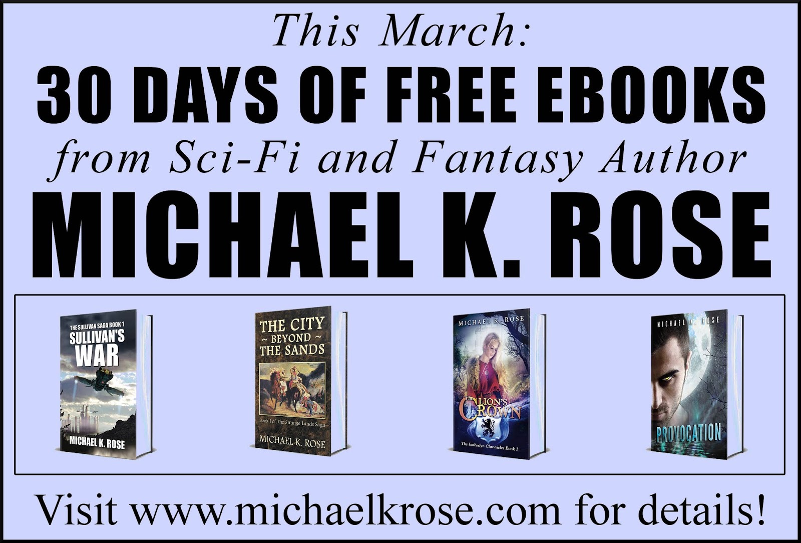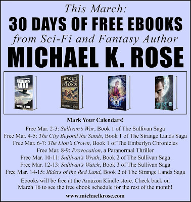 Sale details: Sullivan's War, Sullivan's Blood and The City Beyond the Sands are free May 6-10. Sullivan's Wrath and Sullivan's Watch are 99¢/£0.99 May 6-10 at Amazon.com and Amazon UK only. Riders of the Red Land, The Sea Dragons and Provocation are 99¢/£0.99 May 6-12 at Amazon.com and Amazon UK only.