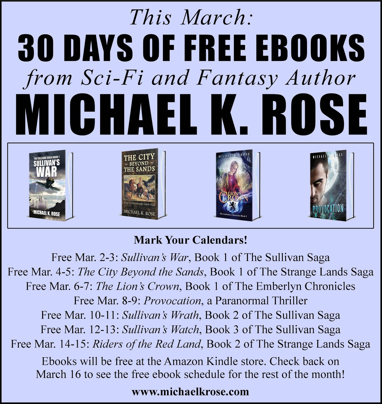 Half the month is already over, but there are still plenty of opportunities to get in on the action! Below is the free ebook schedule for March 16 through March 31. Enjoy!