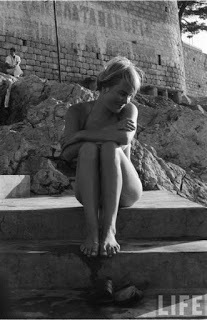 Marianne bathing on The RockShall I tell you what he was? He was gorgeous. (See Gorgeousness.) Not that he thought so. One of his poems speaks of hours in the mirror. “You hide your double chin, even from yourself.” At his tryst with Janis Joplin,