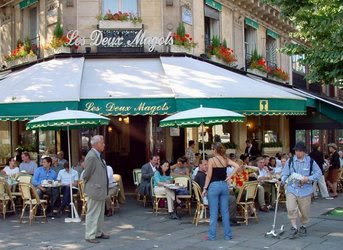 Since last I was here they have renamed the adjacent pavement La Place Sartre-Beauvoir. We have come from the upscale to the boho. Here gather the extravagantly garbed, the extensively tattooed, and bored middle-aged intellectual women with loose wind-blown gray hair and jeans. (See In Praise of Older Women.) The Quartier has heroically resisted gentrification, and offers a sidewalk show of shabby artiness worthy of the struggling Wagner, the broken Wilde, les clubs de bebop. One feels at home, but not young. (How could one?) Ah, but the food! Les Deux Magots comes across with millefeuille de tomates et chevre frais—disks of tomato, fortified by their own skins, in alternate layers with disks of chevre, very agreeable—as a prelude to magret à l'orange, orange duck breast (we started with duck; let’s stay with duck), the purée maison (mashed potatoes with a great deal of butter) and two glasses of Bourgogne Petit Chablis, big deal, but they pour you a full one at Les Deux Magots, which is a mark of royalty. It was a gorgeous experience. (See Gorgeousness.)