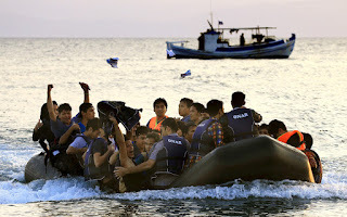 From this distraction I raise my head at the sound of shouts. A rubber raft full of refugees is approaching the beach! I wade in, drink in hand, to greet them but they file past, barely looking at me. “Where’s Germany?” they say. I can only wave vaguely toward it and watch them head off, craning as if to see it.