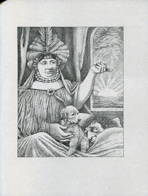 In his preparatory notes for the illustrations for "The Fisherman and His Wife," (the woman pointing at the rising sun above; right: preliminary sketches) Sendak wrote, "No fish! No hut! No palace! Her à la Grafina Potatska! Yes!" Grafina Potatska, an idiotic Polish count, was what Sendak's mother called his father when she was angry with him. The woman's expression is his mother's. The puppy on the bed is Sendak's golden retriever Io.