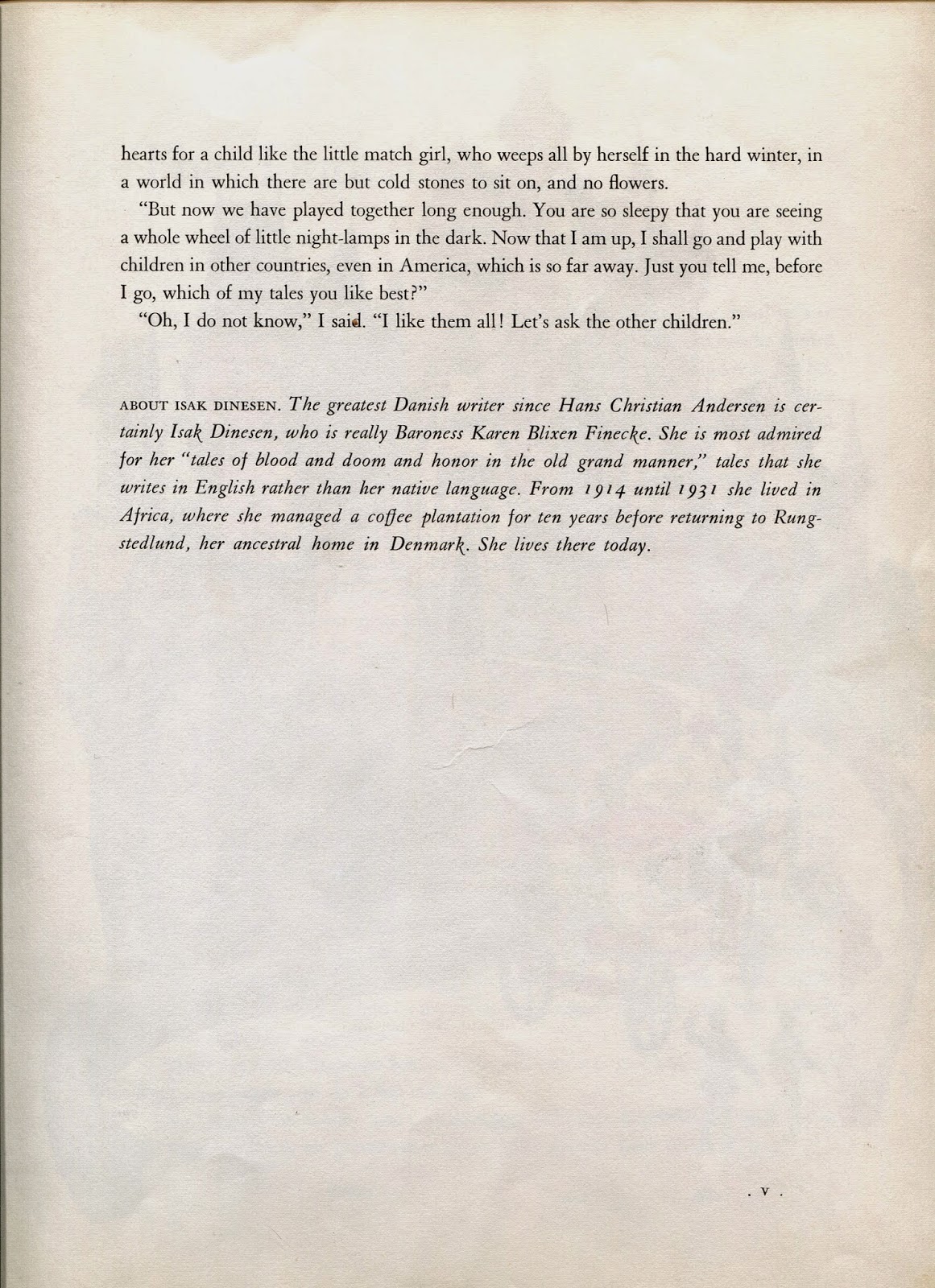 The child Dinesen, or perhaps it is the adult writer Dinesen, says "I like them all! Let's ask the other children."