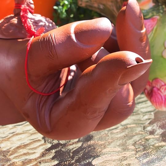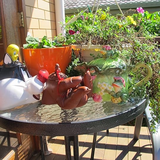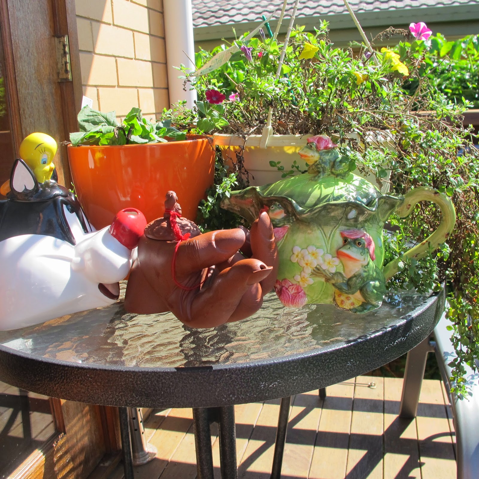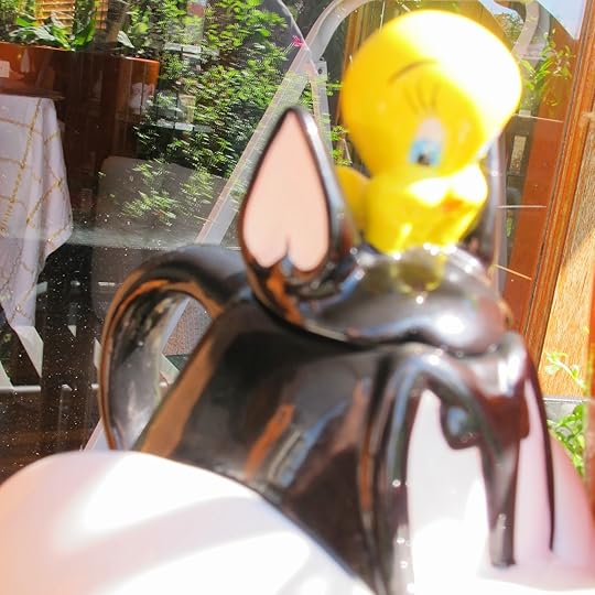 The Frog teapot. Bought at Maleny in Queensland, Australia, by a lady I worked with years ago, and given to me for Christmas. Val was one of the nicest people I've ever met. She was always cheerful, and thoughtful and her kindness often made difficult days bearable. I lost track of her when I moved jobs but, thanks to the kind of person she was and her kind gift, I'm always reminded of her and the way  Buddhsomething as simple as a smile can help people.a's hand. This was given to me by a well-travelled friend. She found it on one of her trips to China and immediately thought of me. The teapot has always made me laugh and has always made me relax. I don't know if the story is true but apparently the monkey-on-the-brain lid signifies that no matter how smart you think you are, monkey is always smarter. I've always interpreted that, loosely, to read 'don't sweat the small stuff'. It works. Tweetie and Sylvester. Childhood memories. It doesn't matter how much Tweetie and Sylvester bicker, they belong together. They're a combination that most people would think would be enemies but they're lost without each other. I always admired Sylvester's devotion (albeit misguided) and Tweetie's strength of character.