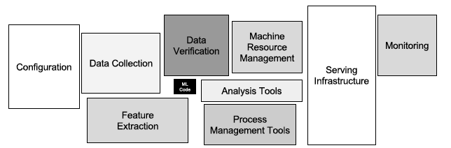 Мои впечатления на эту тему совпадают с фразой и иллюстрацией из интересной статьи Hidden Technical Debt in Machine Learning Systems опубликованной сотрудниками Google: "It may be surprising to the academic community to know that only a tiny fraction of the code in many ML systems is actually devoted to learning or prediction (Для научных сотрудников может быть удивительным, что только мала часть кода во многих системах построенных на алгоритмах машинного обучения, в действительности относится к обучению или предсказанию)".