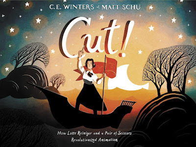 My debut picture book biography, Cut!: How Lotte Reiniger and a Pair of Scissors Revolutionized Animation, is now available! Matt Schu is the illustrator, and his drawings spectacularly bring Lotte's real-life world of early-1900s art and cinema to life, while also paying tribute to the exquisite use of shadow of light in Lotte's films.