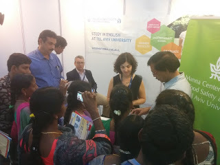 Maya running our booth.Obviously, Maya Oren, the Program Director at Manna, in her sleeveless back dress, and me with light brown hair, and our promoting an advanced educational program, stood out among the sari-clad women and tika-adorned men selling ice cream machines, rice makers and automatic mixers. Our stall was frequented by an endless stream of curious visitors, most long past university age, who eagerly snapped pictures (especially of Maya), took home TAU leaflets, and especially, our keyfobs. Many of the conversations bordered on the absurd – “In which part of India Tel Aviv is?”, “What are you selling?”, “Are you interested in puffballs?”. It was like touring around India, while staying in one place. We quickly adopted the head bob, which we found made us more understood.