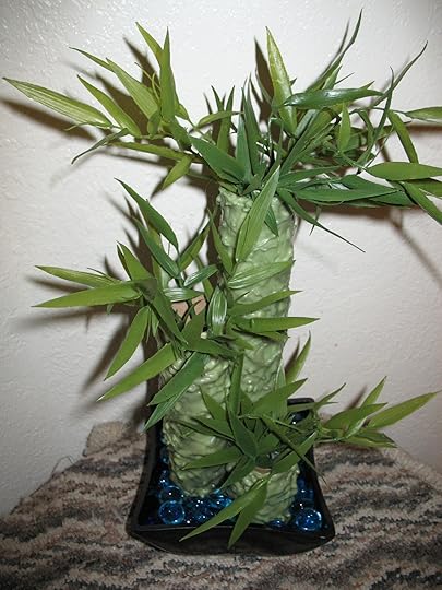 I dripped candle wax over paper towel rolls for the base of the bamboo.  The leaves are plastic leaves cut from a branch in the Hobby Lobby flower department and though you can't see both colors very well in the ceramic bowl, there are blue and dark purple glass beads in a square bowl.  The beads are from Pets Mart and the bowl from Hobby Lobby.