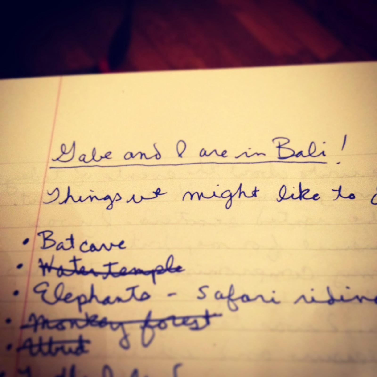After 30+ hours of travel, we arrived on Sunday night to the Bali airport in Denpasar to broken ATM machines and difficult decisions about whether to declare Gabe's oranges. For brief moments I was terrified we would spend the week in Bali without a way to get cash. But we found a working ATM and for probably the only time in our lives, we got to view bank balances in the t...