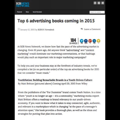 Thanks B2B news for calling @youthnation one of the most important advertising books of 2015. Coming April 20th. Link to pre-order in my profile…. (at YouthNation)