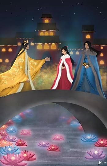 In the scene this piece depicts, our main character, Meiawen, is enjoying a festival with Keir, a handsome duke, as they stroll over a bridge bathed in the glow of the lotus lanterns along the frozen canal below. When they encounter the infamous and immortal Emperor, however, the evening takes an unexpected turn. To make matters worse, Meiawen might also be keeping a dangerous secret that the Emperor must never discover.