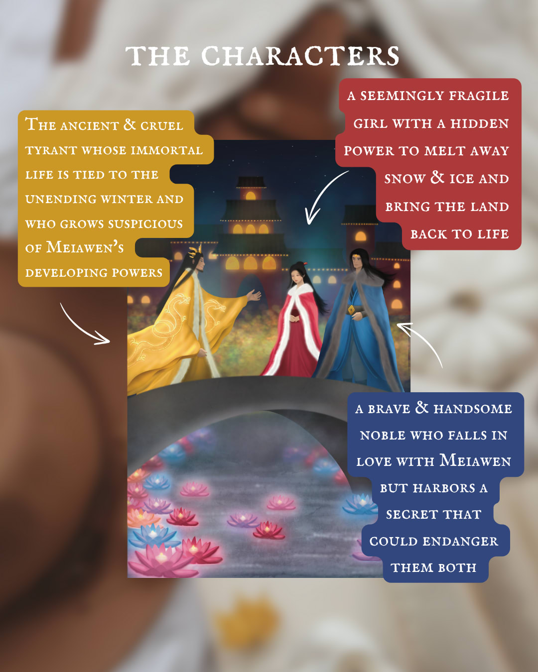 Winter in the Shaolyu Empire has lasted for thousands of years. On the night of a terrible blizzard, Meiawen is born but barely survives the chilling temperatures. For years afterward, she remains overly sensitive to the cold. Yet when Meiawen nearly sacrifices her life to rescue a stranger in a storm, she is gifted with magic of her own. Meiawen’s new powers not only allow her to no longer become sick from the cold but also give her the ability to transform into a bird and melt away the winter around her, bringing the land back to life.