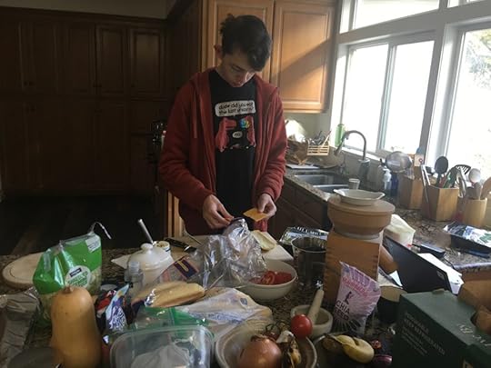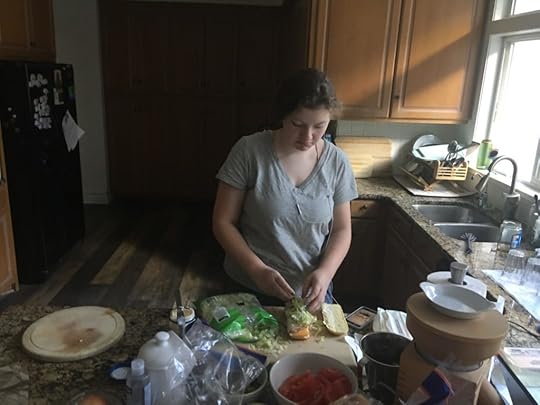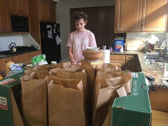 Today is the first Saturday of the month, so it’s Sandwich Ministry time. This is a practice that my congregation started years ago, and which we joined enthusiastically when we discovered it. In 2020, due to social distancing, etc., the congregation has stopped doing it, but we, together with our neighbors the Rickses and the Averys, have carried on. Here are the kids making hoagies to go into the 30 lunches we delivered to the Food and Care Coalition this morning.
