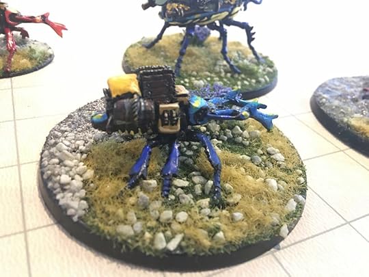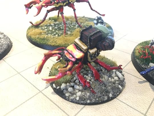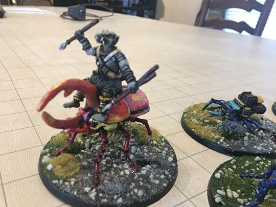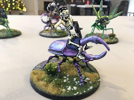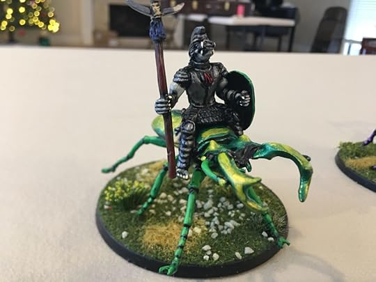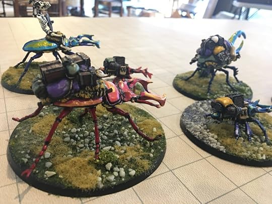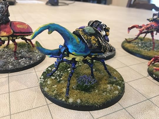 The last week or so, I’ve been hammering out short stories like a madman (working on a new Hiram Woolley story this morning for inclusion in my collection next year). But that doesn’t stop me from moving forward with other kinds of WIP. Here are some beetle-mounted trolls and pack beetles from Mad Knight Miniatures that I finished painting yesterday.