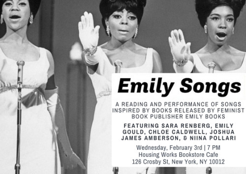 Emily Gould, Chloe Caldwell, Joshua James Amberson, and Niina Pollari will read from each of the books. A performance by Sara Renberg and her band will follow.