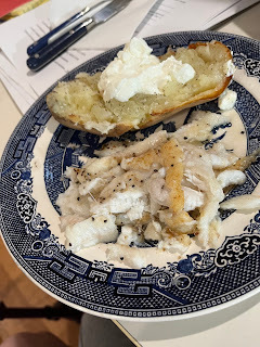 Tonight, Christian is inCoppell, with his dad who is not doing well after surgery, Jacob is off being ahigh school graduate, and Jordan and I looked at each other and said, “Wha’sfor dinner.” Then she added, “I’m probably not going to eat what you eat,” andtruth is she wouldn’t have; I planned to use that smoked salmon in scrambledeggs. But then, just in time to order from Central Market, she called andasked, “Fish?” I ordered filets of Dover sole, one large baking potato, and afew other things we needed. We feasted on a shared potato and generpid helpingsof sole. (Note to self: a quarter pound filet is enough for one, unless maybeit’s Christian.) I must explain the picture above—that fish is hash not becauseI need small bites but I have rarely been capable of cooking sole filets thathold together. Now I know why it’s so expensive in restaurants. But, to justifymyself a bit, Jordan got her helping out in one fairly good piece, and here’s apicture of the two left-over small filets that I cooked after weAlmost pefect filets