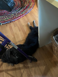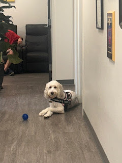Benji had a spell of jealousythis evening, though he was, as he always is, good natured about it. Themedical office where I had an appointment today had a therapy dog. That’s Chloeabove—a lovely (and calm) two-year-old Aussiedoodle. At one point we heard ascratching at the exam room door, and the woman with us asked, “Do you likedogs?” Jordan and I assured her we do, so she opened the door, and in cameChloe with a ball in her mouth ready for us to throw. With the door closed andno place to throw the ball Chloe allowed us to love on her a bit and then laydown for a nice nap. Quite a contrast to Benji who jumped about wildly when wecame home and then, a few minutes later, when Mary arrived.