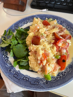 Tonight, though, I fixed thedish I’d been thinking about—eggs scrambled with a diced green onion, dicedtiny tomatoes (maybe not a good idea because of skins), smoked salmon, and ahuge spoonful of cottage cheese. With more watercress. Tasted so good, and itwas nutritious and pretty to look at, though I warn if you try it, the eggswill seep as you eat—it’s the cottage cheese separating and nothing to worryabout. And I finished both meals with chocolate bonbons. I am in danger,however, of running out of bonbons. I’m not normally an ice cream devotee, andI think now I’m interested in them mostly for the chocolate covering. I amafraid to try my beloved chocolate-covered salted caramels. All in all, I feelwell fed. Now for some ideas for the rest of the week. One day I have toeliminate all good things—meat, dairy, mayo, etc. and eat lots of leafy greens.I can sauté in olive oil, so I’m working on that. Sauteed cabbage sounds good,but no one would eat the rest of the head. This is all for a Pet Scan.