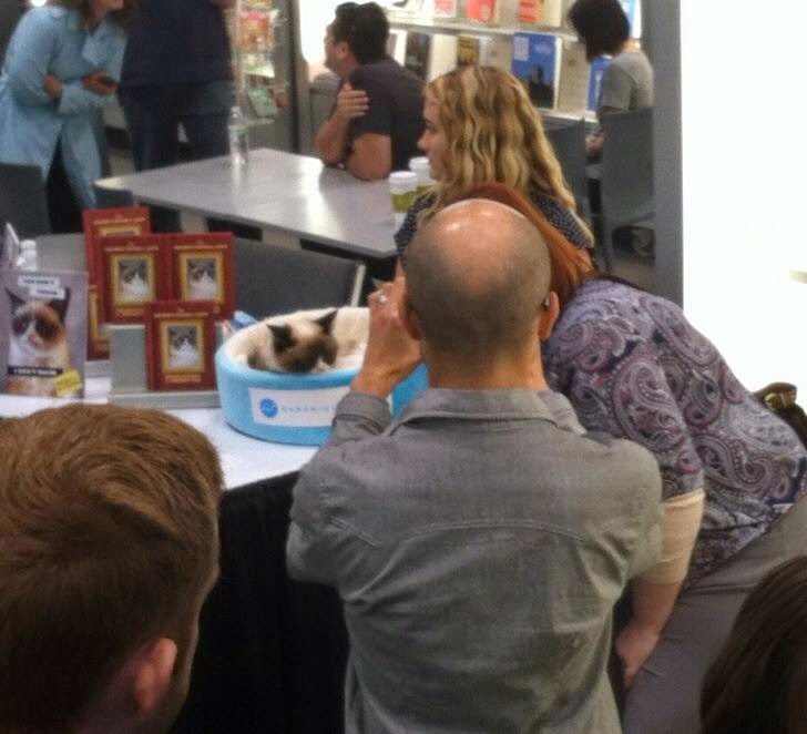 at Book Expo in New York this past weekend, and I jumped at the chance. I was just a few booths down from Grumpy Cat, who has a new book that has already sold more copies than all human books combined, yet there was enough attention to go round--I was supposed to sign for two hours but we ran out of books in 30 minutes! Sure, they were free books, but still! Here, enjoy some photo evidence: