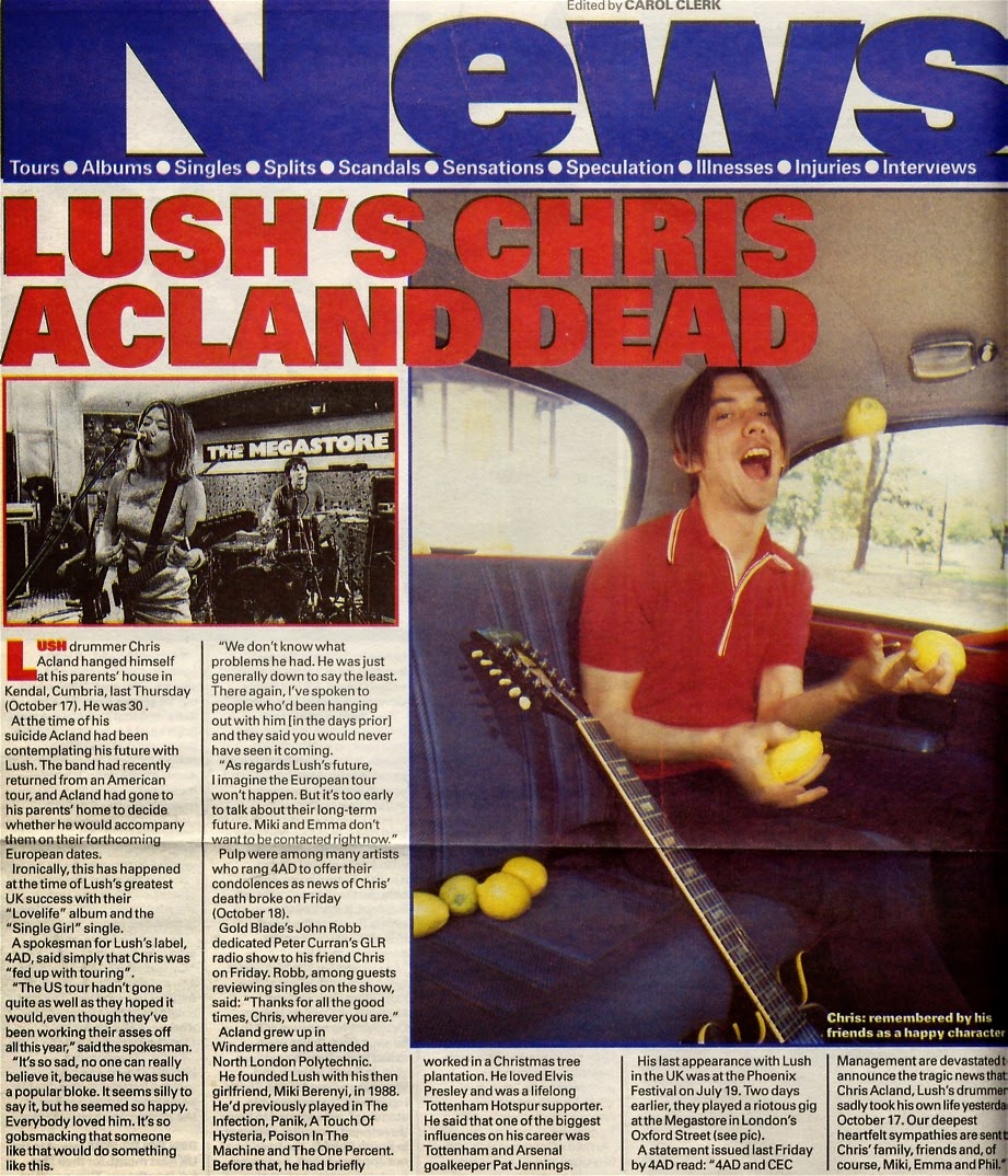 Lush released one final single, "500 (Shake Baby Shake)," which hit #22, before tragedy struck: guitarist Emma Anderson, exhausted from the band's incessant touring and feeling overwhelmed by the demands being placed on the band by their American label, announced she wanted to leave the band, and two days later, drummer Chris Acland, always such a delight in interviews and by all accounts a happy guy, hanged himself in his parents' house in the Lake District. He was only 30 years old. The remaining members were obviously devastated--Chris wasn't just a bandmate, he was a close friend and Miki's former boyfriend. (Miki herself has said she'll never understand why he did it.) With the death of one of their core members, Lush disintegrated, officially disbanding in 1997.Sadly, Lush has been largely forgotten in the years since their breakup, and they are now little more than a footnote in the histories of the shoegazing and Britpop scenes of the '90s. This is a total bummer, and one hopes that with the resurgence in interest in shoegaze in the past few years, the band will finally get some respect. Gala alone deserves the world's attention. It was their purest musical expression, the sound of a young band downing some shots, hopping in the pool, and splashing around gleefully. It's one of my top 10 favorite albums. (That's right, I said it.) The band never topped it.