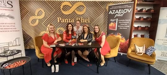 Dátum, tretieho augusta, sa niesol v duchu besedovania a krstenia kníh. Začalo sa knihou Iba s tebou, o ktorej je predchádzajúci článok. Nasledovala kniha Azaelov pád, ktorá vzišla z pier piatich slovenských autoriek – Baja Dolce, Ivica Ďuricová, Michaela Zamari, Vanda Kys a Vladimíra Šebová. Bohužiaľ z dôvodu pretrvávajúcich opatrení sa besedy a krstu nemohla zúčastniť Vladimíra Šebová, ktorá žije v Prahe. Autorky nám porozprávali o tom, ako vznikol projekt Autorská štafeta, kto bol jej hlavným iniciátorom, a taktiež opísali, ako prebiehala ich vzájomná spolupráca. Dozvedeli sme sa, či si vedia takýto spisovateľský počit predstaviť aj v budúcnosti. Osobne musím všetkým autorkám poďakovať za tento príbeh, pri ktorom ma mrazilo, dychtivo som čítala, len aby som sa dozvedela, ako budú osudy postáv a dej pokračovať. Ospravedlňujem sa za mierne roztrasený obraz. Niekedy som sa pozabudla a zahľadela som sa na autorky a až neskoro som si uvedomila, že niečo nesedí.