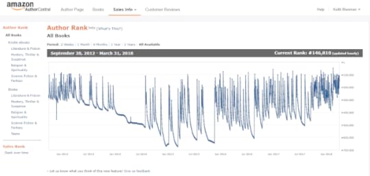 For any of my fellow independent authors out there, if you've never looked at your sales rank at authorcentral.amazon.com, I highly recommend it. Along with viewing your books' current rankings, you can view your overall ranking in book sales, keeping track of data from as little as the past two weeks, to as long as you've been publishing. Or at least since September 28th, 2012. You'll forgive me for not researching that date further, but I think that's the date they started keeping track of sales in this format. I've actually been self-publishing on Amazon since 2001, and on the Kindle since 2008. So I don't know if the September date is arbitrary, or if the folks at Amazon actively decided against showing me number prior to 2012 as they were just that depressing.