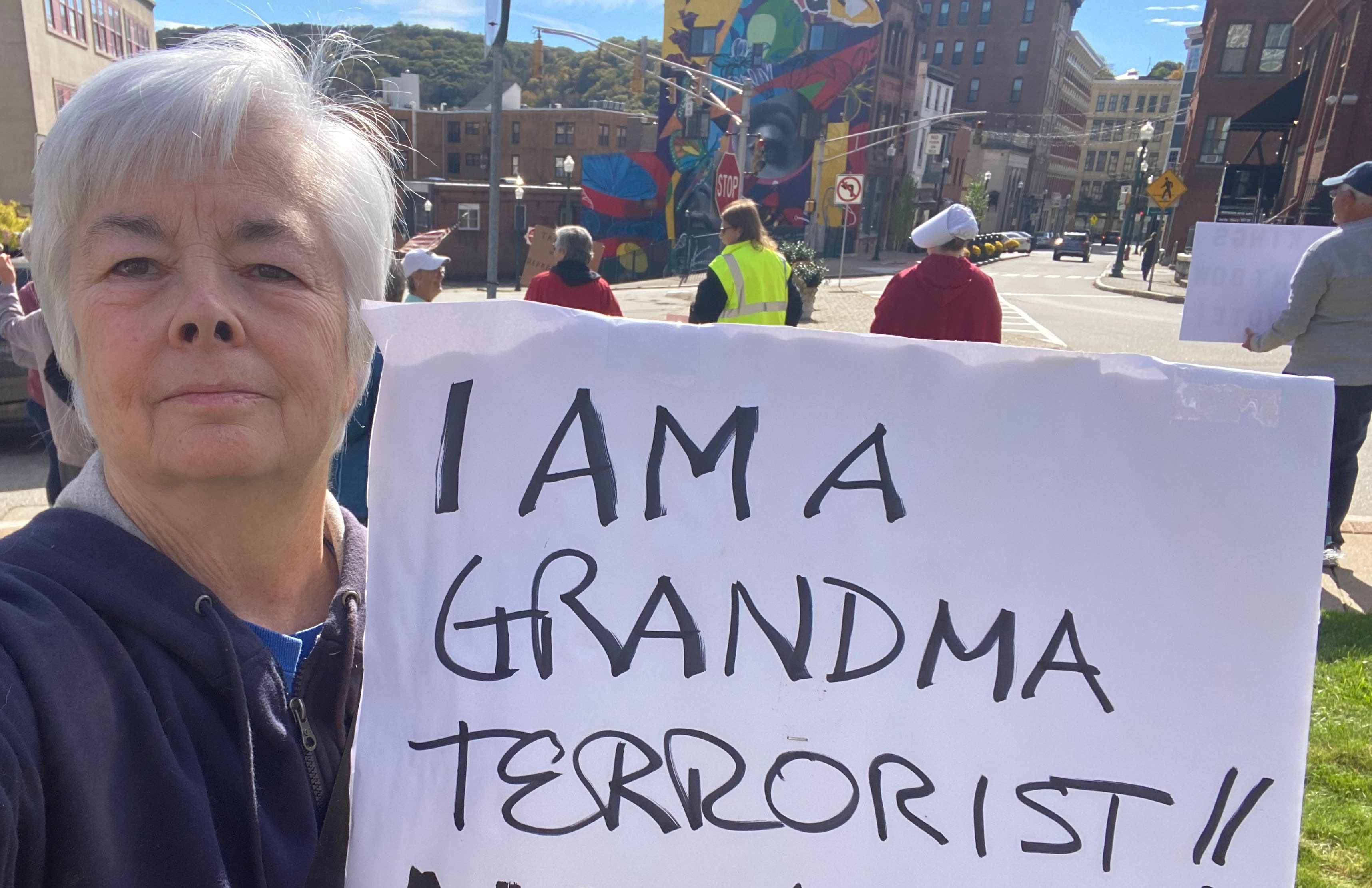 So there I was waving my, “I AM A GRANDMA TERRORIST” sign in front of the ornate city hall of Norwich, Conn., along with about 200 others. It had the atmosphere more of a fall festival than a Marxist celebration.
