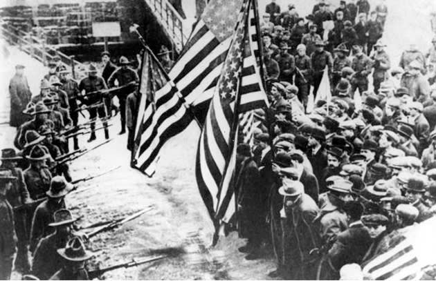 Strikers facing soldiers with fixed bayonets in 1912Yet the 10-week strike changed America. Congressional hearings exposed horrifying factory conditions. The mill owners, knowing a public relations disaster when they saw one, raised pay and slowed down the machines. Child labor laws passed.