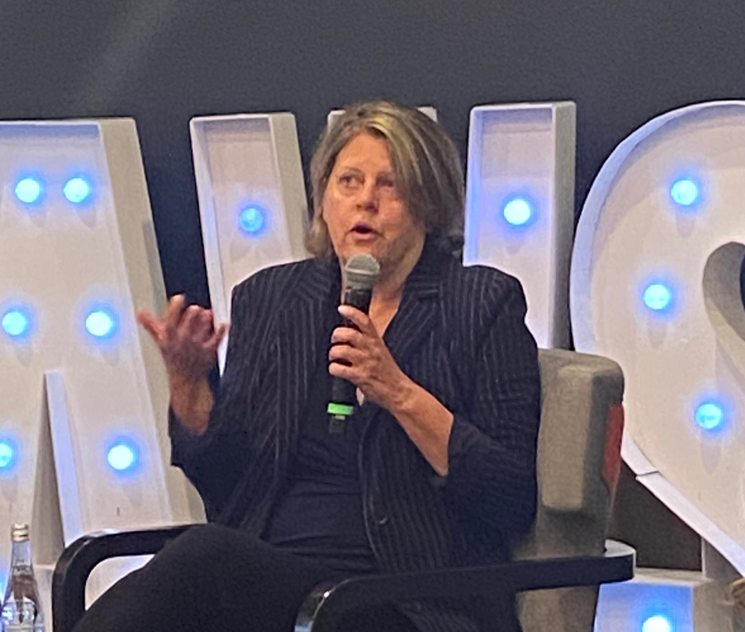 Sally Buzbee speaking at the Journalism and Women’s Symposium (JAWS)) conference Sept. 6. That’s “JAWS” on the stage behind her.“The world is massively interested in what is happening with this administration. But sometimes Americans are really turned off. They are really not paying attention to this stuff,” she said. “So we have to figure out how to capture what is happening without being so shrill that no one is reading you. For me right now, Reuter’s matter-of-factness is useful to the world. We are literally not shying away from reporting ... But it’s exhausting, right?”