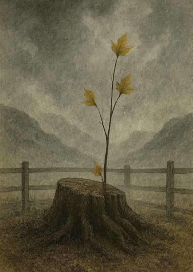 Infant sycamore leaves; early burnt yellow, not fully chlorophylled, unable to photosynthesize yet, clung to three slender shoots rising…