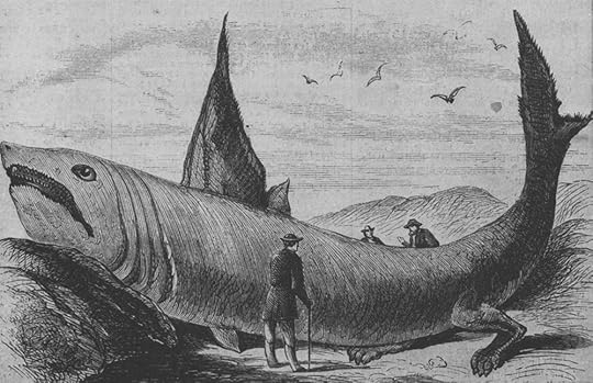 Basking sharks have been at the centre of a number of strange stories. One of the strangest occurred in Eastport Maine in October 1868 when a 30 foot ‘wonderful fish’ washed ashore. Its mouth was five or six feet wide and had hundreds of teeth, as do basking sharks. Strangely, this beast was said to have two legs with webbed feet near the back of its body, as illustrated in Harper’s Weekly below.[iii] Crowds came from far and wide to witness the strange hybrid sea monster.