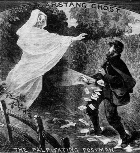 In September 1881, an unnamed postman was on his way to pick up the mail that was arriving on the night train to Garstang, near Preston in Lancashire. As he walked down the dark country lane, a white ghostly figure appeared before him. It was, according to press reports, of ‘abnormal stature’ and a ‘horrid pallor of hue’. The figure seemed to be giving mysterious and portentous signs in a ‘variety of terror-striking gestures….’