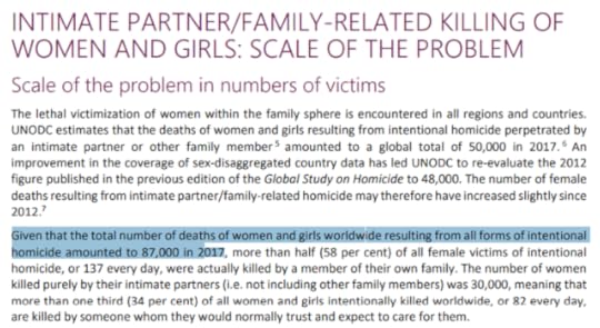 Usemos de nuevo la misma falacia. En la fuente de donde se ha obtenido el listado de muertes de la imagen superior no aparece (o yo no he encontrado) la cifra de mujeres muertas por violencia de género. Sin embargo, encuentro este dato, del año 2017, en una web de la ONU:
