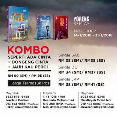 Nak order yg combo pun boleh jugak. SEPERTI ADA CINTA dan 'rakan-rakannya' iaitu JAUH KAU PERGI 2017 (karya Dhiya Zafira) dan DONGENG CINTA (karya Lynn Dayana).