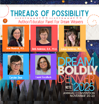 If you are attending the National Council of Teachers of English (NCTE) conference in Denver, check out my author panel entitled "Threads of Possibility." I'm honored to be presenting with Colorado authors Beth Anderson, Jolene Guitaerriez, and Dow Phumirik. Joining us from New Mexico is Laurel Goodluck. I will be sharing a poetry writing activity from my book, Story Frames for Teaching Literacy: Enhancing Student Learning through the Power of Storytelling.
