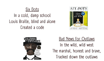 In my book, Story Frames for Teaching Literacy: Enhancing Student Learning Through the Power of Storytelling, Chapter 10 is about "Poetry: Exploring the Power of Language and Story Through Verse." In that chapter, I discuss using haiku to create mini book summaries. The one below is based on Six Dots: A Story of Young Louis Braille, written by Jen Bryant and illustrated by Boris Kulikov