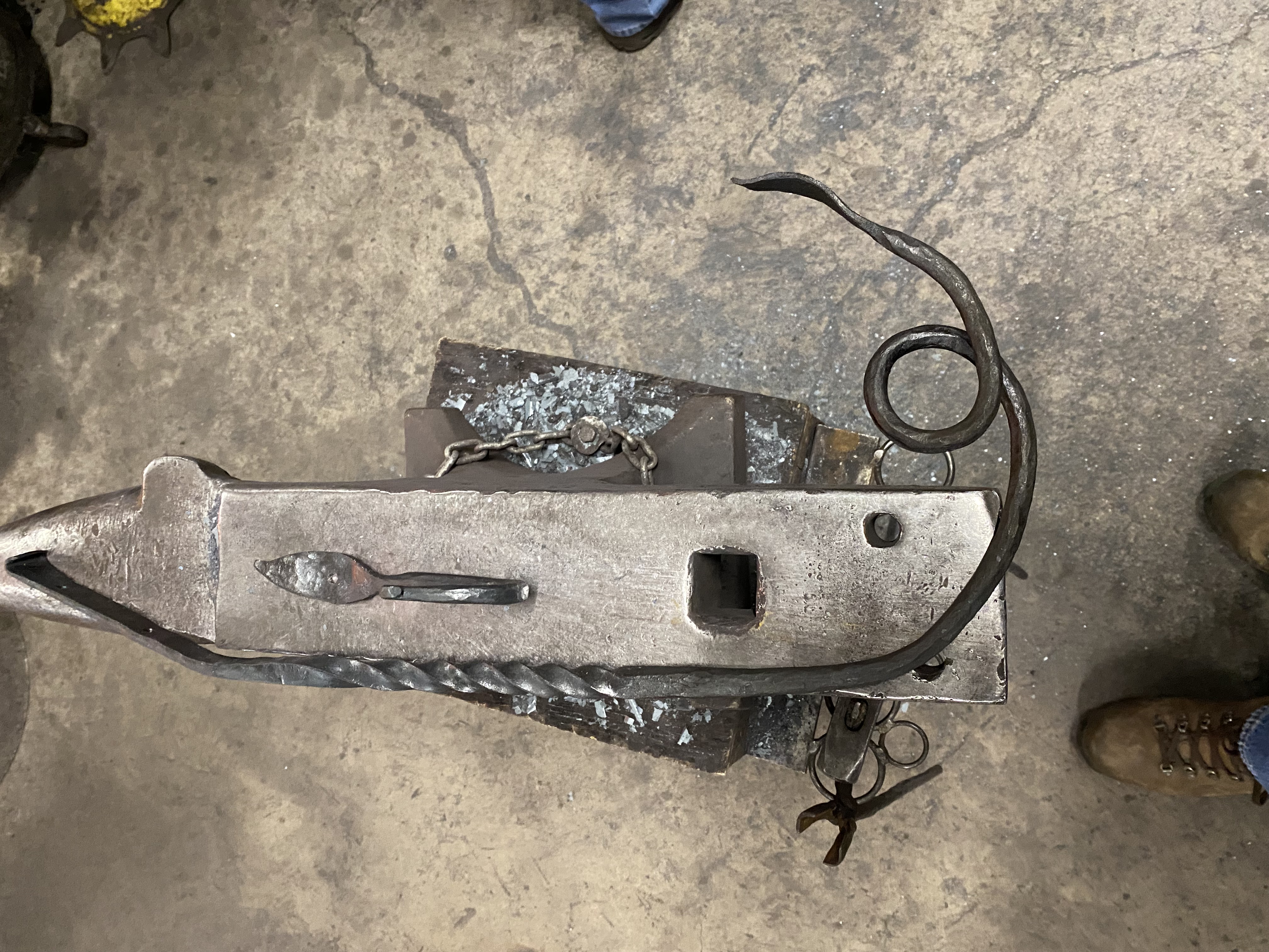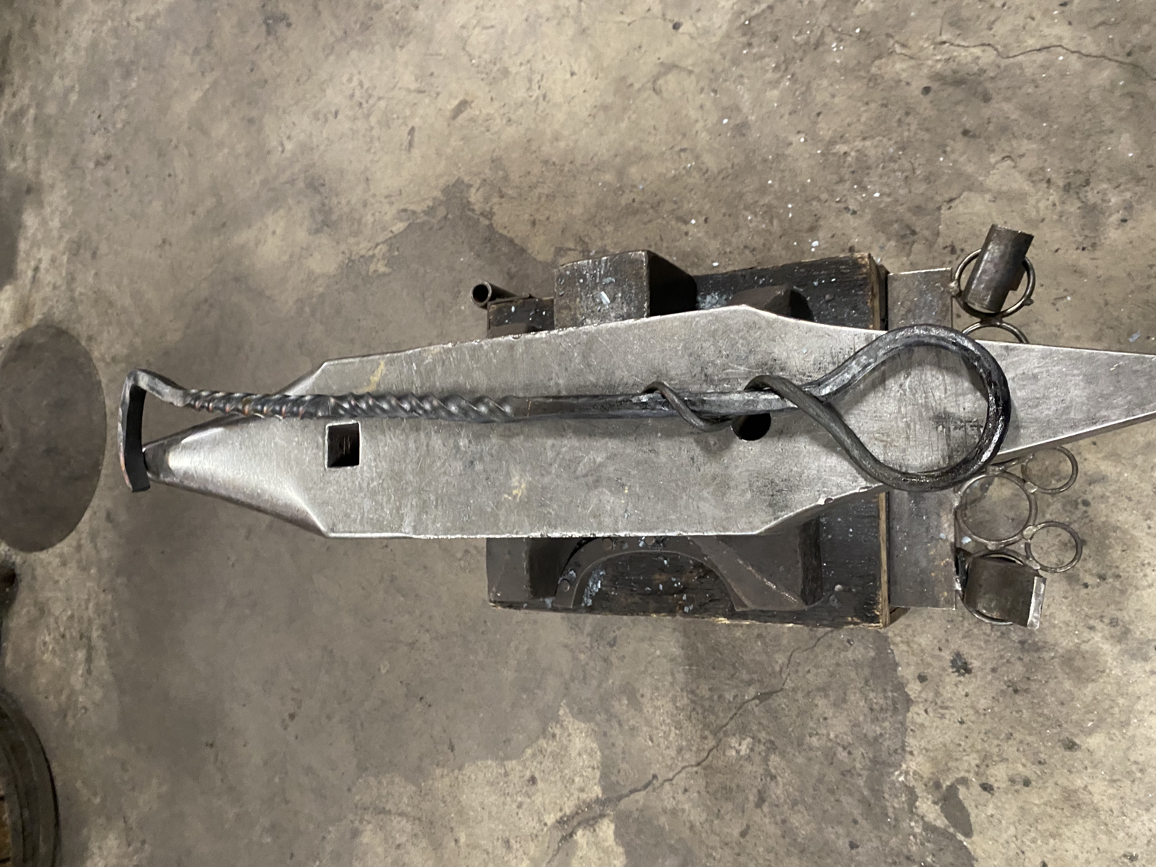 The basic class teaches you to use the hand tools to move metal. We made leaves so that we can learn how to direct and shift metal, we drew out and thinned square rods, create twists, and learned a better way to make 90-degree bends. That first weekend, I came home with a wall hook, a plant hanger, and a fire poker. As well as a fairly sore body.