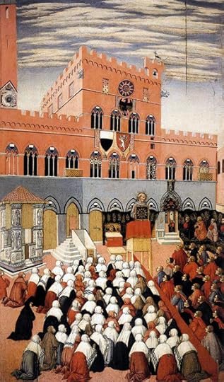 Saint Bernardino(1380-1444) preaching in Siena before the Palazzo Publico. Notice the clock on the left hand tower. The painting is by Sano di Pietro (1406-1481)