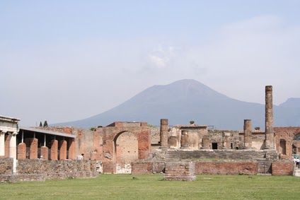 The Apostle Paul wrote The Book of Romans in 57 A.D. The eruption of Vesuvius destroyed Pompeii 22 years later, in 79 A.D. The following photo shows Mount Vesuvius looming over the ruins of Pompeii.