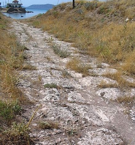 The following photo shows the ruins of the diolkos at the Lechaeon harbor on the west. . (Attribution: By Dan Diffendale [CC-BY-SA-2.0 (http://creativecommons.org/licenses/b...)], via Wikimedia Commons)