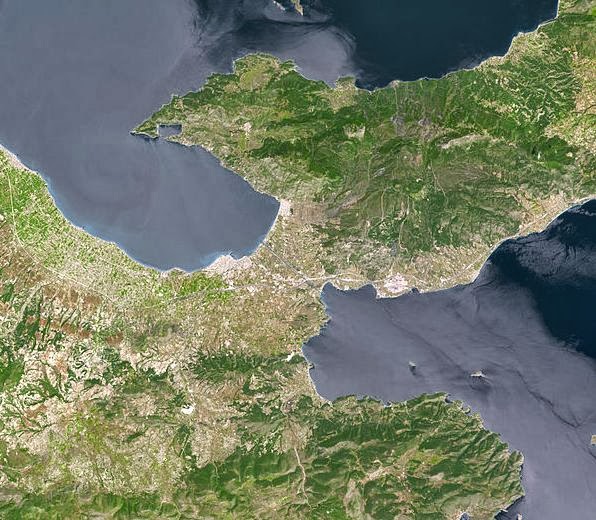 The following photo shows the Isthmus of Corinth. (See the narrowest strip of land.) Today there is a canal (built in the 1800) so boats can sail between the Lechaeon harbor on the west and the Cenchrea harbor in the east. The canal is 4 miles long. It is too narrow for modern ships. (Photo Attribution: By Jesse Allen [Public domain], via Wikimedia Commons)