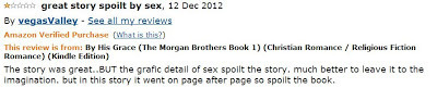 Hello Kathleen Wiseman,I've read the review titled " great story spoilt by sex" for the book titled "By His Grace (The Morgan Brothers Book 1) (Christian Romance / Religious Fiction Romance)." I understand your concerns, but the review doesn't violate our posted guidelines, so I'm unable to remove it in its current format.