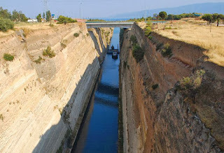 Back in early Christian times, there was a marble pathway across the Isthmus, and boats were hauled onto rollers and pulled across by slaves from one harbor to the other. The alternative was to sail a dangerous sea journey which lasted for 200 miles. The road was marble. This was called the "diolkos."The following photo shows the ruins of the diolkos. (Attribution: By Heinz Schmitz (http://outis.info/archaia_f/1411/isth...) [CC-BY-SA-2.5 (http://creativecommons.org/licenses/b...)], via Wikimedia Commons)