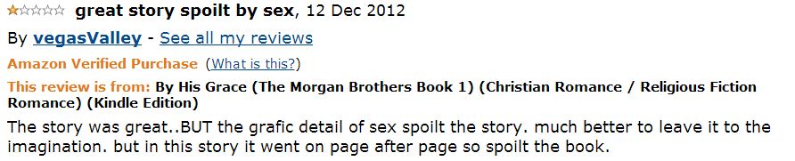 I've read the review titled " great story spoilt by sex" for the book titled "By His Grace (The Morgan Brothers Book 1) (Christian Romance / Religious Fiction Romance)." I understand your concerns, but the review doesn't violate our posted guidelines, so I'm unable to remove it in its current format.