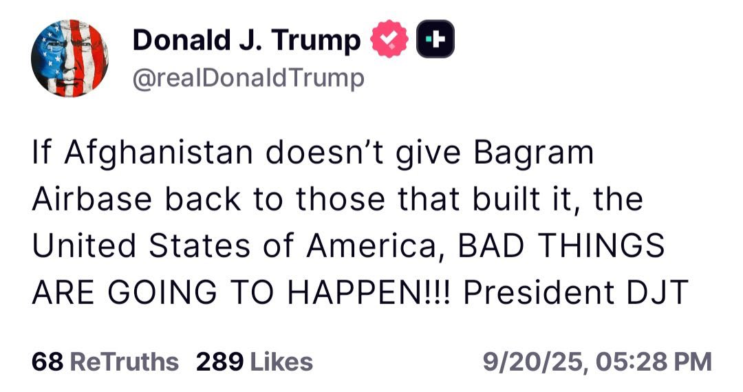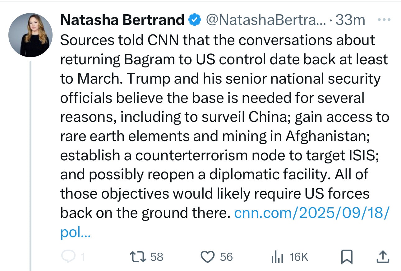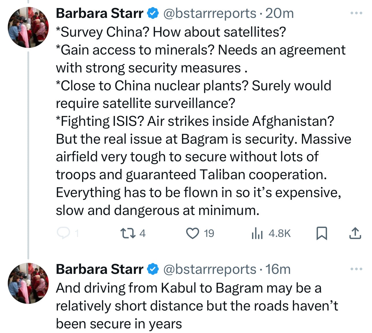 Timestamp: (51:48). President Trump threatens to go back into Afghanistan — a war he helped end. Trump wants to re-take/re-control Bagram Air Base.